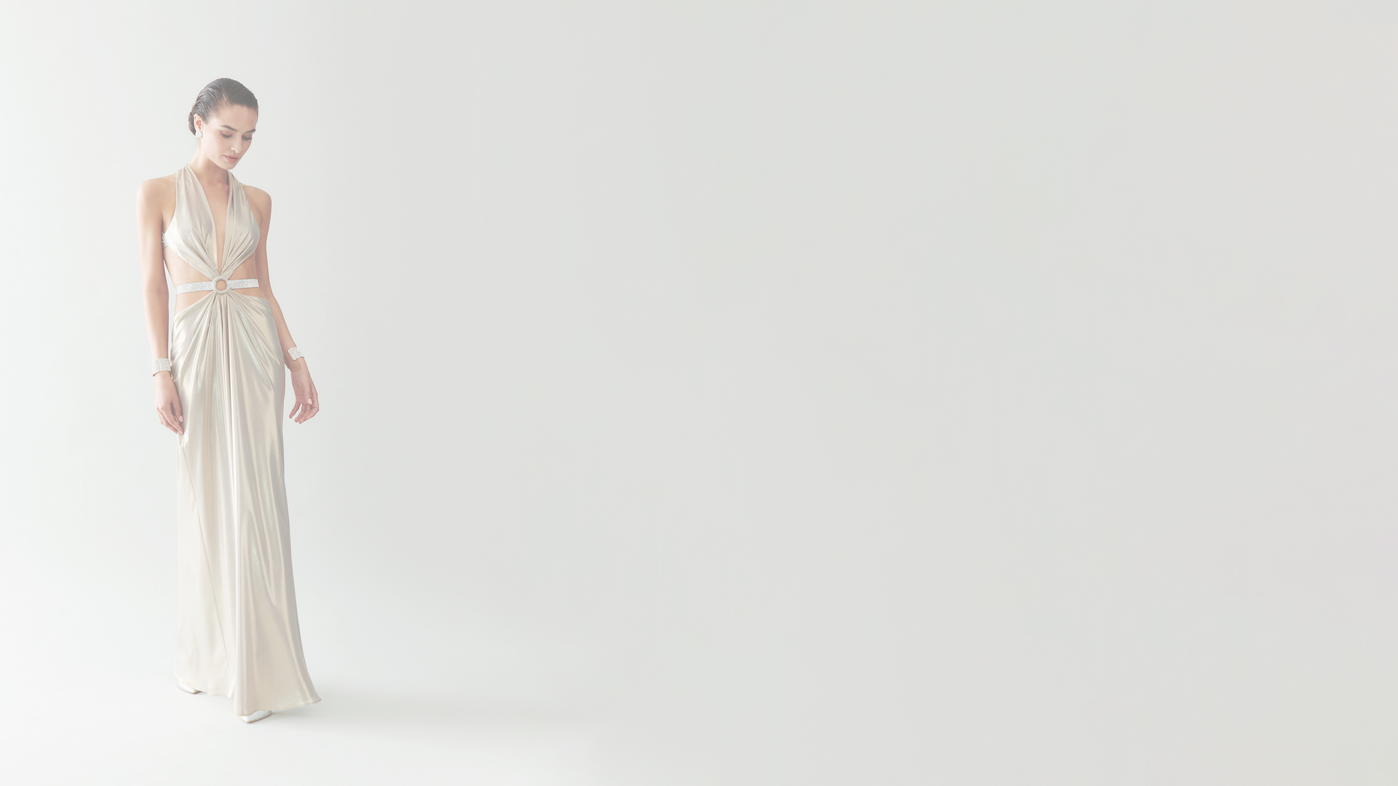 A satin princess dress with a structured bodice and an elegant skirt with tailored pleating that gives the piece sophisticated movement. Satin-covered buttons adorn the central back and a narrow belt highlights the waist.
