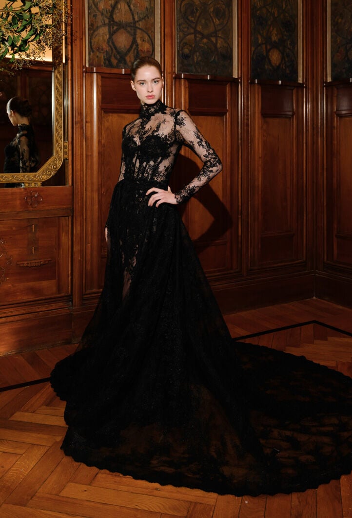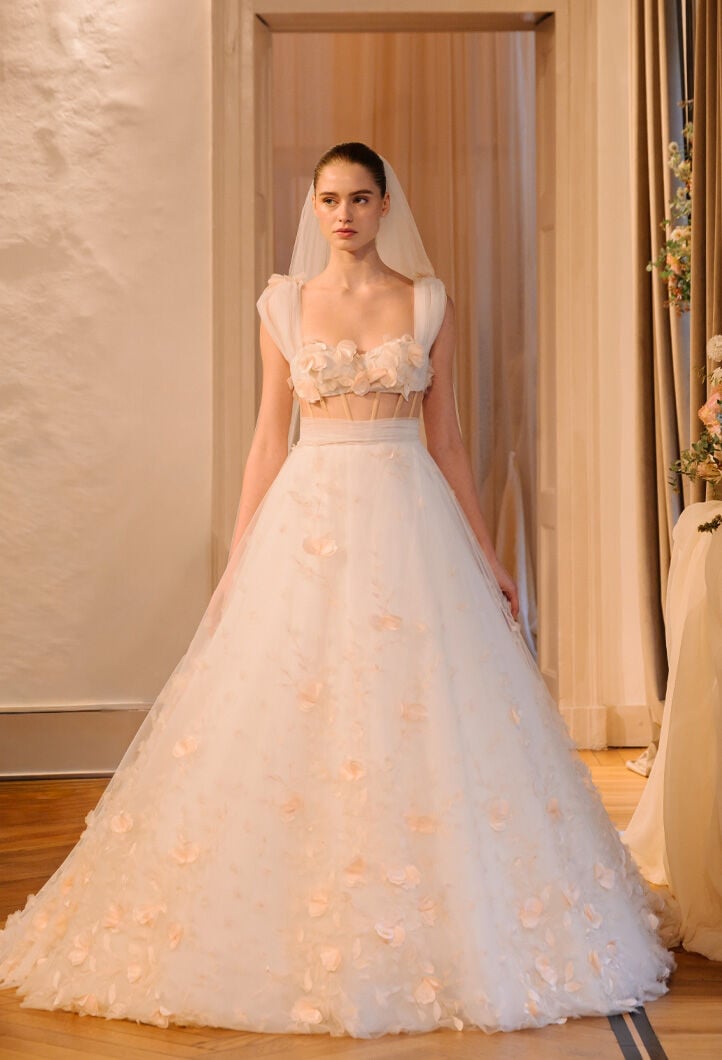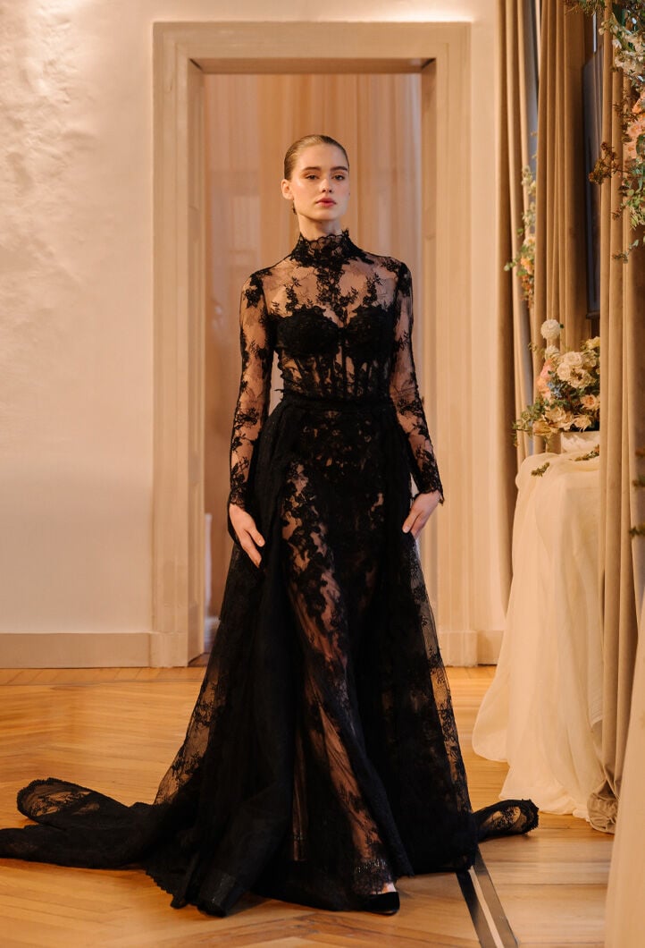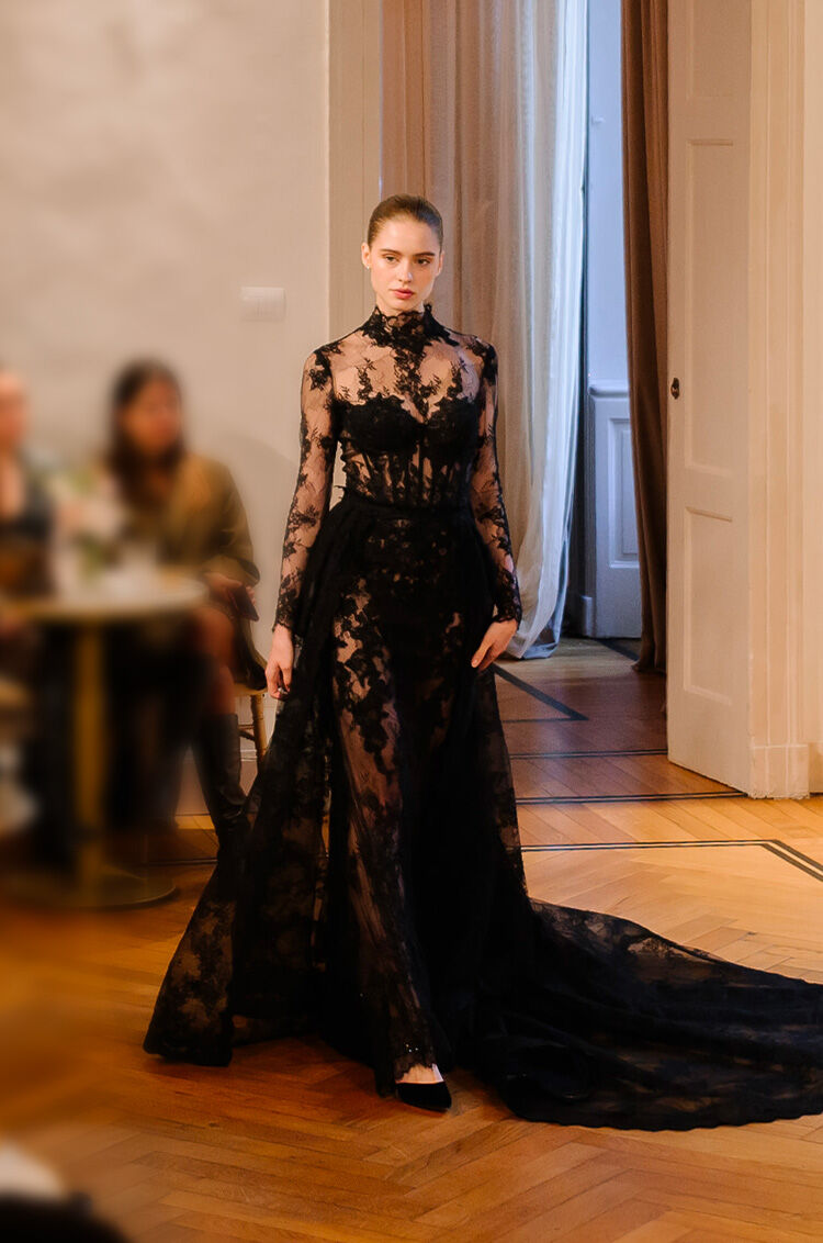 Abiti unici, realizzati a mano, reinterpretano la femminilità con romanticismo, eleganza e dettagli preziosi, tra sfumature di bianco, tocchi poetici di rosa cipria e un audace total black.