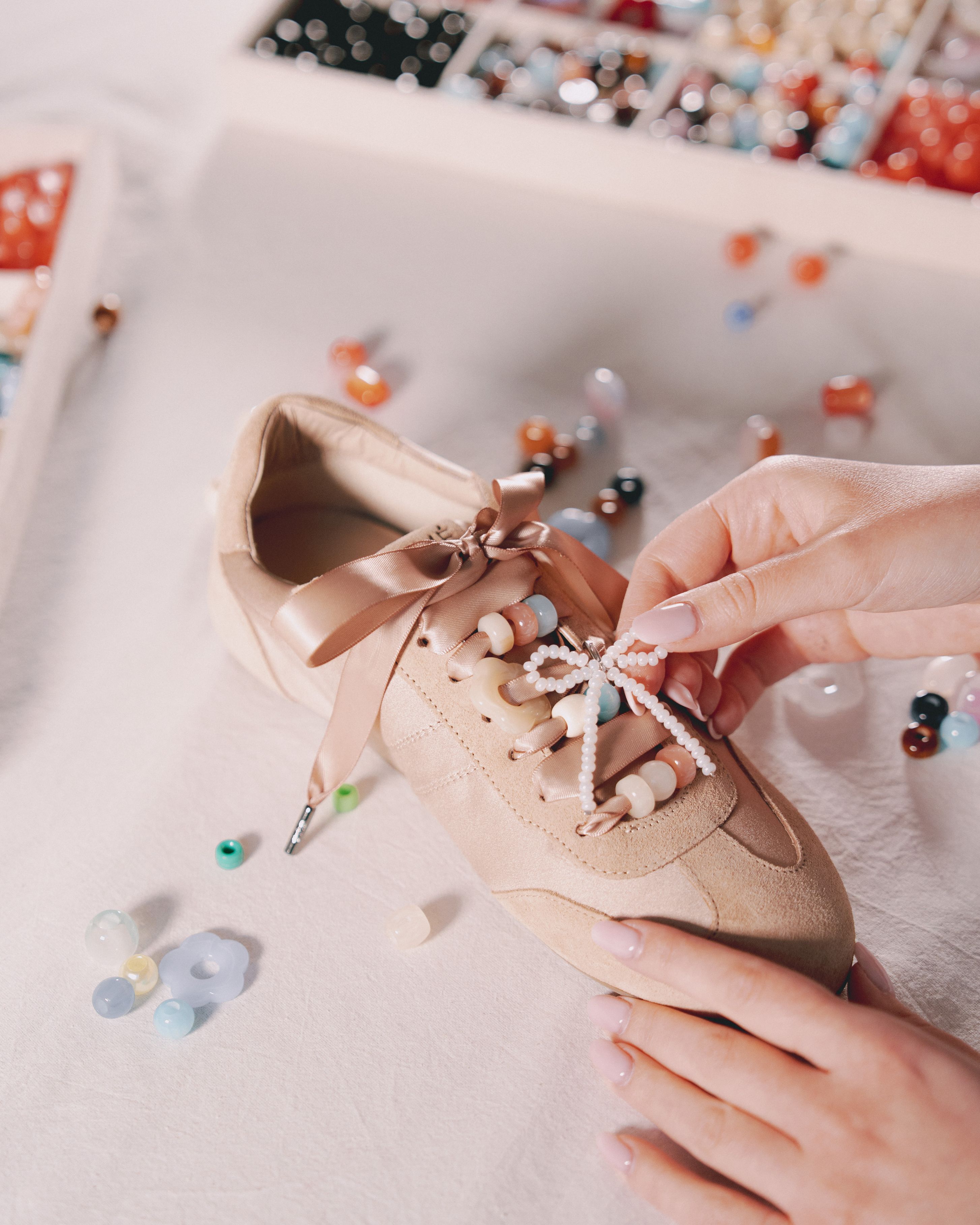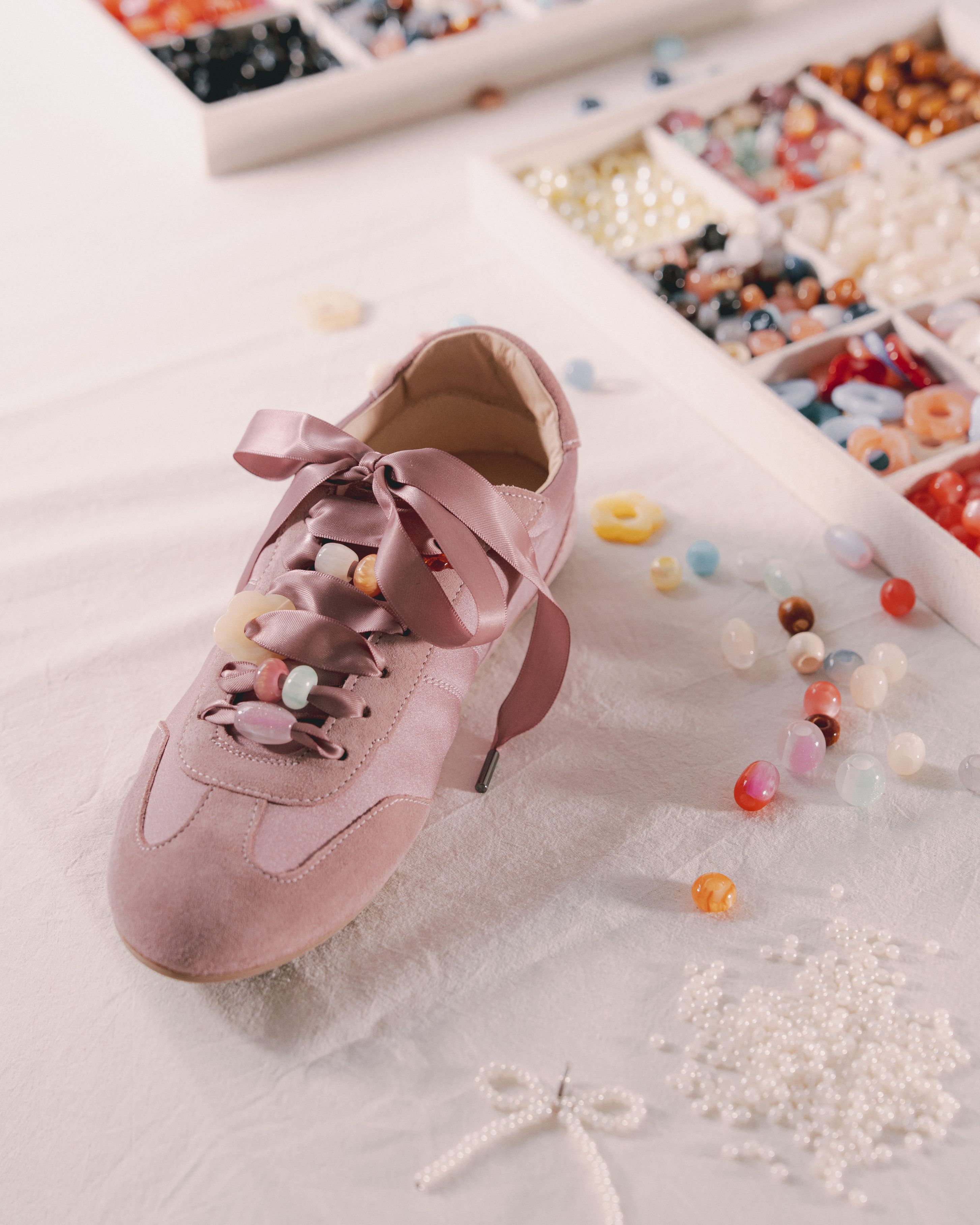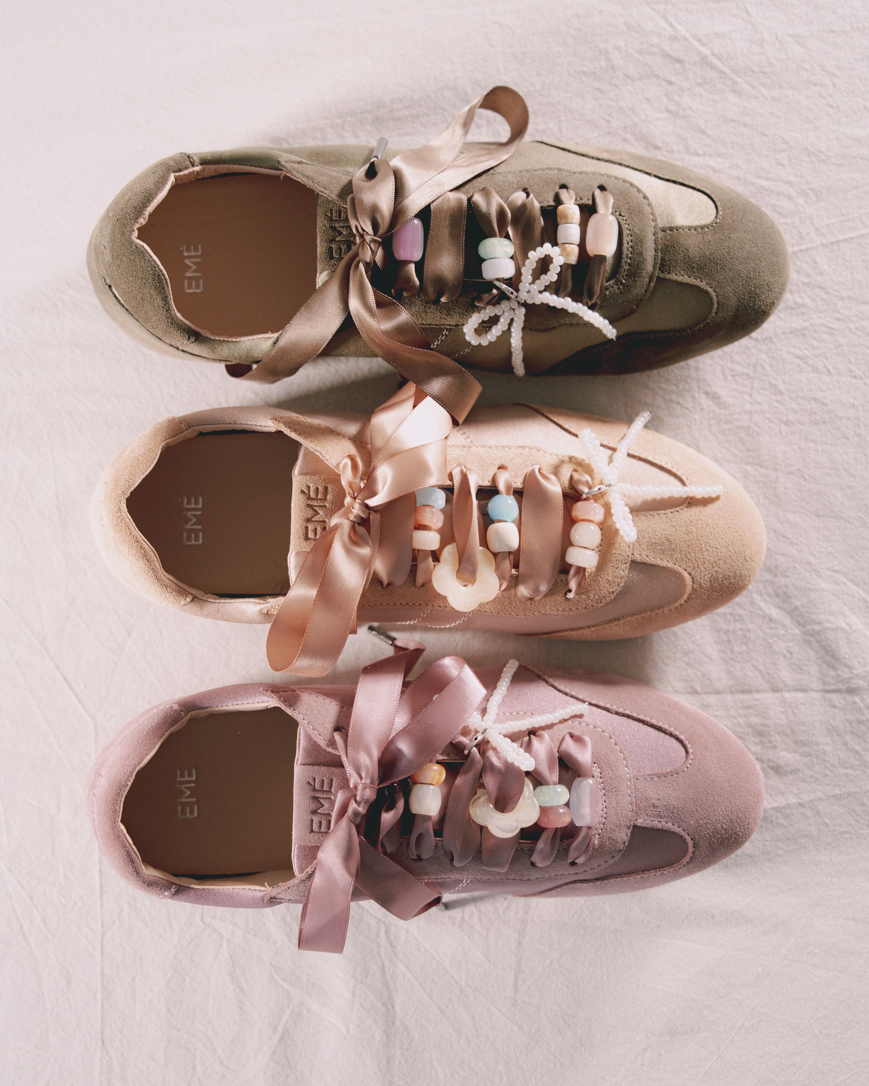 Le sneakers in raso Emé diventano una tela da personalizzare con una selezione esclusiva di charm firmati Collanine Colorate: un mix di colori, forme e simboli pensati per raccontare la tua personalità.